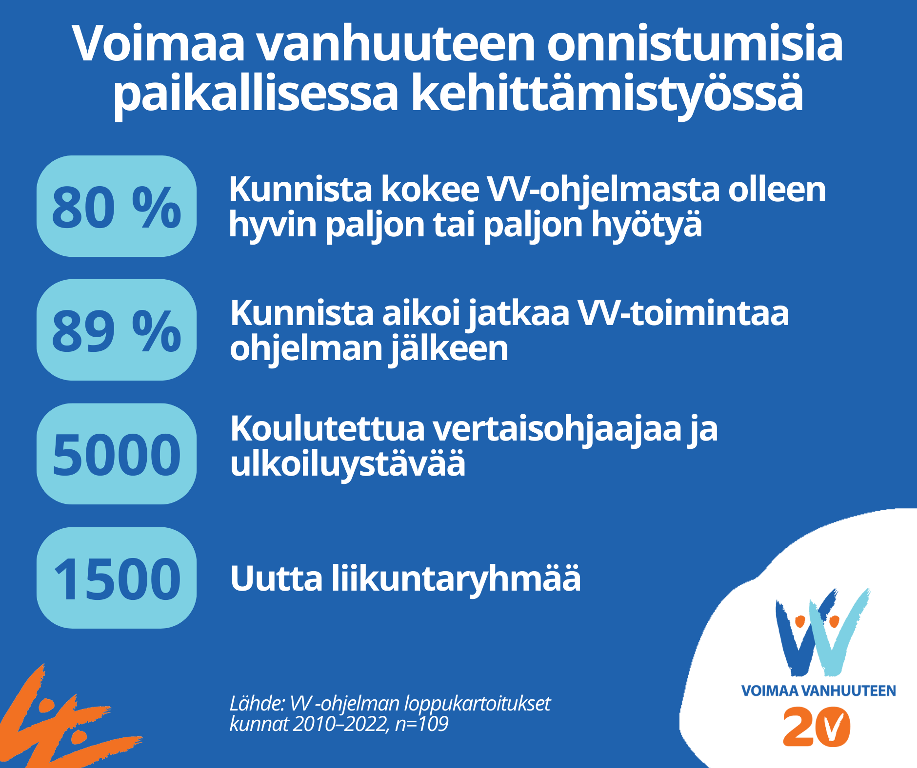 - Voimaa vanhuuteen IV 2023-, alueellinen toiminta 3 hyvinvointialueella, mukana 47 kuntaa